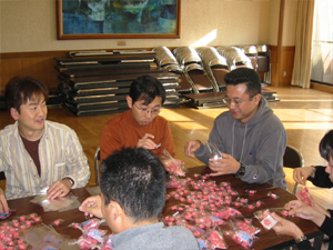 ○まずは、がんばって300セット以上を売り上げた福高金太郎飴の袋詰め作業です。サンプルを1つずつ詰める作業は、前の週に終わらせてくれていて、前日は10個セットの袋詰めでした。